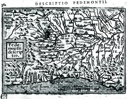 Contenuta in: P. Bertii, Tabularum geographicarum…, 1602. La carta presenta pochi toponimi delle valli valdesi. Bibliografia: F. Barrera, Il Piemonte nella cartografia del Cinquecento e Seicento, n. 92. |