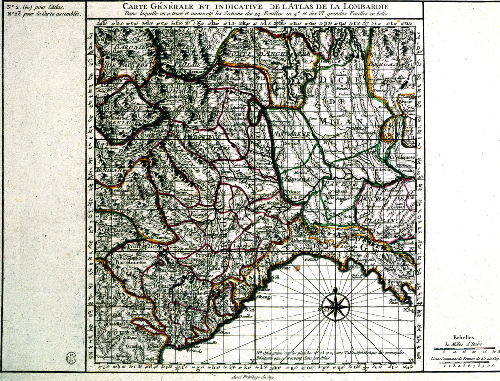 Titolo del Quadro di unione sul margine superiore: "Carte générale et indicative de l’Atlas de la Lombardie dans laquelle on a tracé et numeroté les Sections des 24 Feuilles in 4° et des VI grandes Feuilles in Folio". |