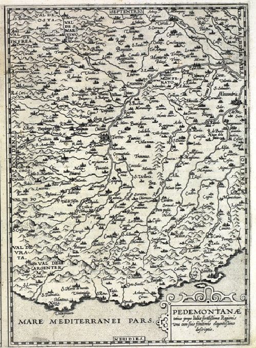 Contenuta in: Jode, Cornelius de, Speculum Orbis Terrae. La carta presenta pochi toponimi delle valli valdesi: Angrogna è situata a sud della Valle Po e il Monviso a nord di Bobbio. Bibliografia: L. e G. Aliprandi, Le grandi Alpi ( 2005), vol. 2, n. 412 ; Torino e il suo orizzonte, n. 9 |